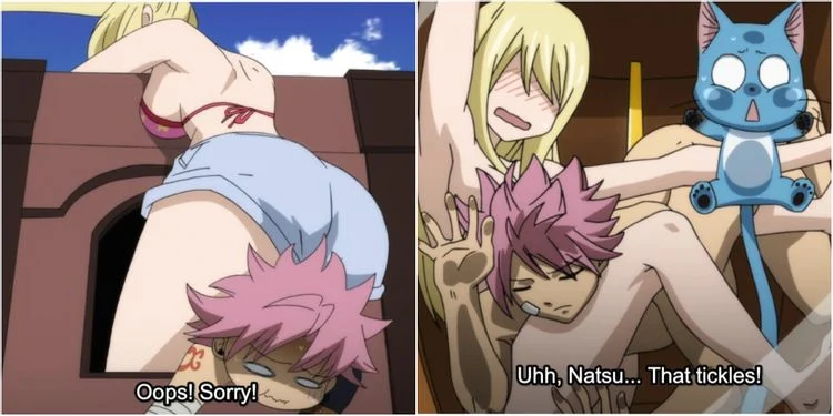 Pas un épisode ne passe sans que Natsu et Lucy ne se retrouvent dans une situation compromettante. Bien qu’involontaire, le degré d’embarras de la première à la dernière rencontre diminue considérablement.